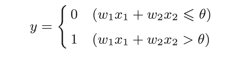 其中x1, x2为输入信号, w1, w2为权重. 图中圆圈称为"神经元"或者"节点". 输入信号被送往神经元时, 会分别乘以固定的权重. 这些信号的总和超过阈值 θ 时, 才会输出1, 称之为"神经元被激活". 即:
